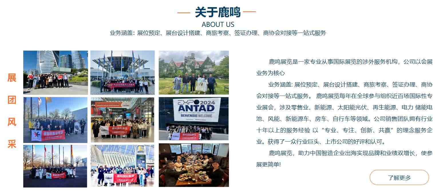 鹿鳴展覽是一家專業(yè)從事國際展覽的涉外服務機構,公司以會展業(yè)務為核心,業(yè)務涵蓋:展位預定、展臺設計搭建、商旅考察、簽證辦理、商協(xié)會對接等一站式服務。 鹿鳴展覽每年在全球參與組織近百場國際性專業(yè)展會,涉及零售業(yè)、包裝、光伏太陽能、儲能、電池、充電樁、可再生能源等領域。公司銷售團隊擁有行業(yè)十年以上的服務經(jīng)驗,以“專業(yè)、專注、負責任”的理念服務企業(yè),獲得了一眾行業(yè)巨頭、上市公司的好評和認可。 鹿鳴展覽,專業(yè)助力企業(yè)拓展全球市場!