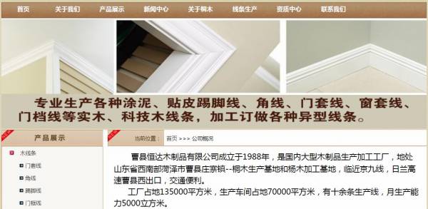 公司集制造、開(kāi)發(fā)設(shè)計(jì)、銷售和服務(wù)于一體,設(shè)備先進(jìn),技術(shù)力量雄厚,供應(yīng)各種實(shí)木和科技木踢腳線,角線,頂線,門套線等,同時(shí)根據(jù)客戶的特殊要求,加工定做各類異形線條,產(chǎn)品健康環(huán)保,不變形,不開(kāi)裂,免底漆省人工,省材料,是目前市場(chǎng)上新型的線條。我司產(chǎn)品已銷往世界市場(chǎng)和國(guó)內(nèi)各地區(qū),年銷售額超2.5億人民幣。在全體員工的不懈努力下,公司不斷的完善和發(fā)展,因?yàn)閷W?,所以專業(yè),產(chǎn)品也受到更多的國(guó)內(nèi)外客戶的青睞和好評(píng)。我司相繼被評(píng)為山東省林業(yè)龍頭企業(yè),山東曹縣十強(qiáng)企業(yè),菏澤市優(yōu)秀企業(yè)家單位,菏澤市外貿(mào)出口50強(qiáng)企業(yè),出口海關(guān)AA類管理企業(yè)等多項(xiàng)殊榮。
