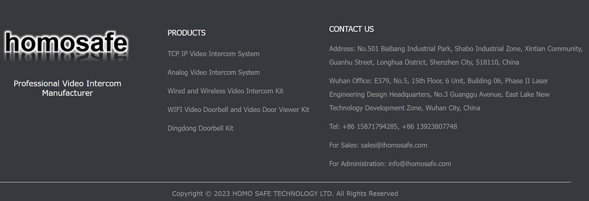 HOMO SAFE TECHNOLOGY LTD.,is a professional video intercom supplier specializing in building video intercom solution, apartment video intercom solution, villa video intercom, hotel video door viewer and so on products, widely apply in residential building, commercial building, apartment, villa, office, hotel varies of applications. Our products are sold all over the world include Middle East, Asia, Africa, Australia, and countries in Europe and South America, built a win-win cooperation relationship with customers.